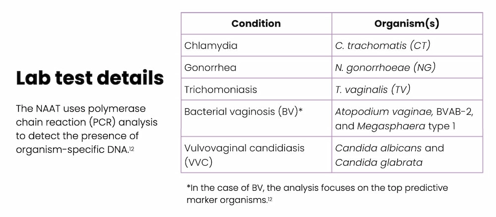 - Vaginal swab is sent to an external lab for a nucleic acid amplification test (NAAT) to detect the presence of organisms that cause conditions suspected in the differential diagnosis (e.g., chlamydia, gonorrhea, trichomoniasis, bacterial vaginosis [BV], and vulvovaginal candidiasis [VVC]).1, 11, 12