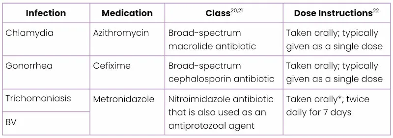 *Based on the Centers for Disease Control and Prevention (CDC) recommendations for BV treatment, metronidazole may alternatively be prescribed as a once-daily intravaginal application over a total of 5 days.22 However, intravaginal application is not recommended for trichomoniasis because this route of administration does not permit the drug to reach therapeutic levels in the urethra and perivaginal glands.22
