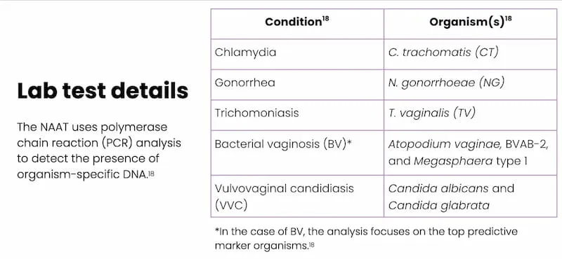 - Vaginal swab is sent to an external lab for a nucleic acid amplification test (NAAT) to test for the presence of organisms that cause conditions suspected in the differential diagnosis (i.e., chlamydia, gonorrhea, trichomoniasis, bacterial vaginosis [BV], and vulvovaginal candidiasis [VVC])14