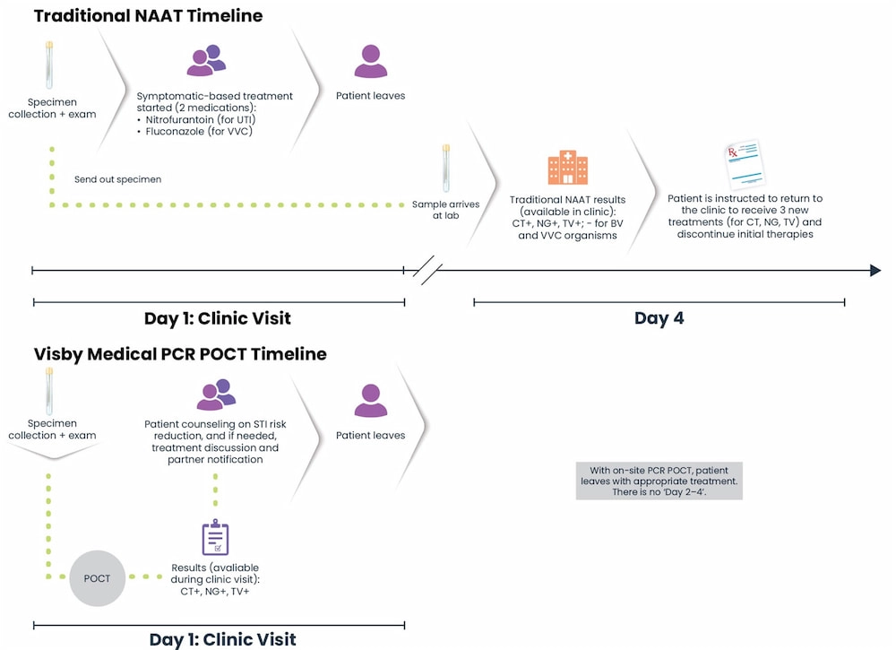 Let’s revisit Suzanne’s story, but see how different it would play out if the clinic was equipped with a rapid, highly accurate POCT, such as the Visby Medical Sexual Health Test…